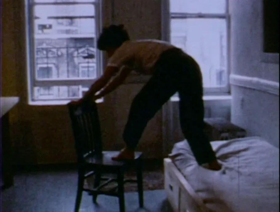 The production of these films intersected with a period in which Kaye was working closely with Simone Forti, who in the the 1960s had pioneered what came to be known as postmodern dance. And in several respects, Kaye’s films encapsulate key tenets of dance and performance art of the time: the movements they capture are task-like, pedestrian—rigorously casual, even. Simultaneously choreographies, performances, films, and documents, they speak to the profound interdisciplinarity of this moment in downtown New York. Yet these films also turn from this paradigm, embroidering their pared-down actions with proscribed elements like narrative and theatricality, heightening an absurdity that was perhaps always latent in the dance lineage from which they emerge. In doing so, Kaye introduces a psychological excess that would increasingly come to dominate her work as a choreographer and filmmaker from 1980 onwards, and which one can retrospectively see percolating under the surface of New York’s larger artistic climate in the 1970s.